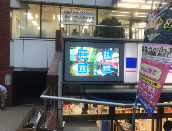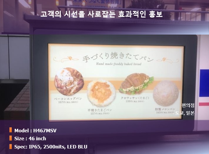 일본 유명 편의점 입구에 현대아이티 아웃도어 사이니지를 설치하여 효과적인 홍보를 진행합니다. 매장 입구 상단에 2500nits의 초고휘도 화면으로 선명항 홍보 영상을 노출하여 집객을 유도합니다.
