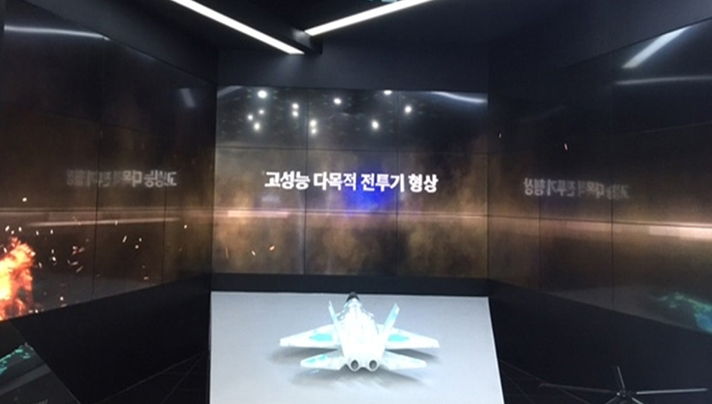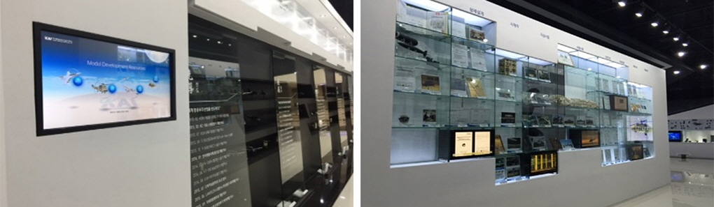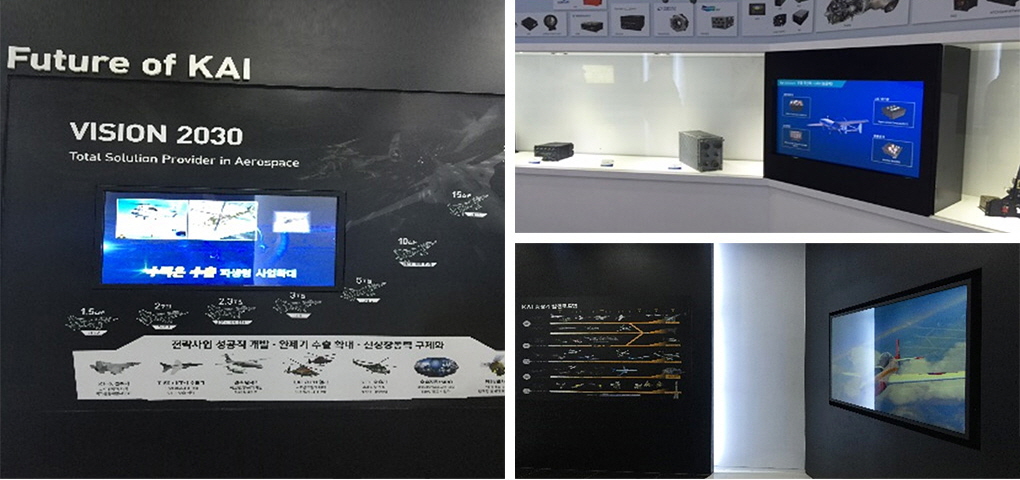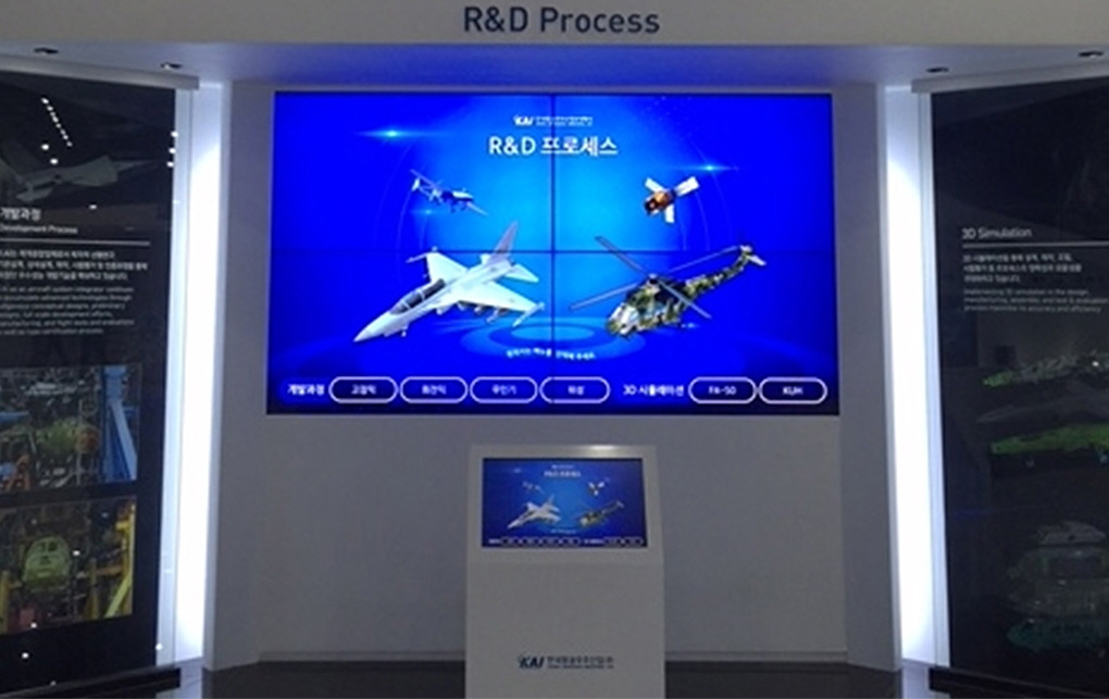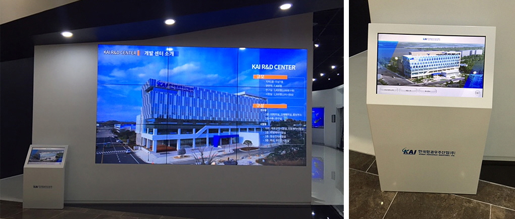 홍보관 입구에 55인치형 9대를 대형 화면으로 구성하고, 키오스크를 서치하여 KAI를 소개하고 있다. 터치 기능의 키오스크는 대형 화면에 연결되어 있어 보고자하는 콘텐츠를 클릭하면 바로 대형화면으로 송출된다.