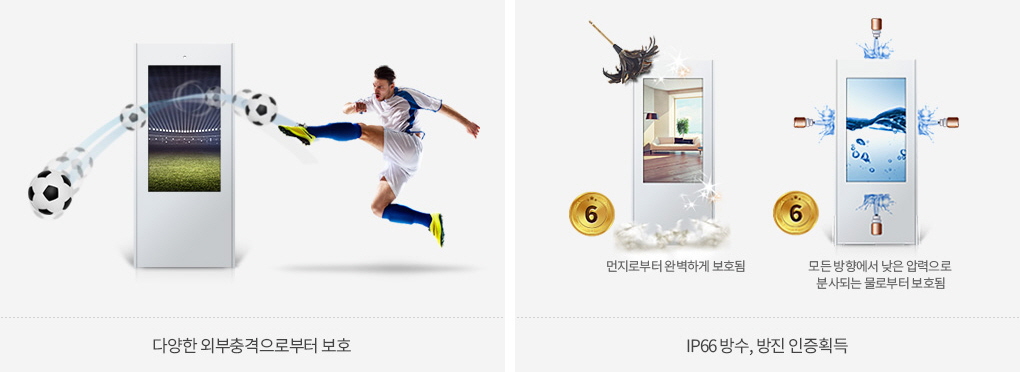 현대 옥외용 디지털 사이니지는 IP66등급의 방수, 방진 인증으로 -30˚C ~ 50˚C 온도에서 뿐 아니라 비나 눈, 먼지에도 안정적으로 동작한다. 이러한 극한 환경 조건 뿐만 아니라 외부 충격에 의한 화면 보호도 필수적인데, 안티-반달글라스(anti-vandalglass)를 적용하여 어떠한 외부 충격에도 화면을 보호하고 분진 및 습기로부터 디스플레이 성능을 장시간 안정적으로 유지시켜준다.